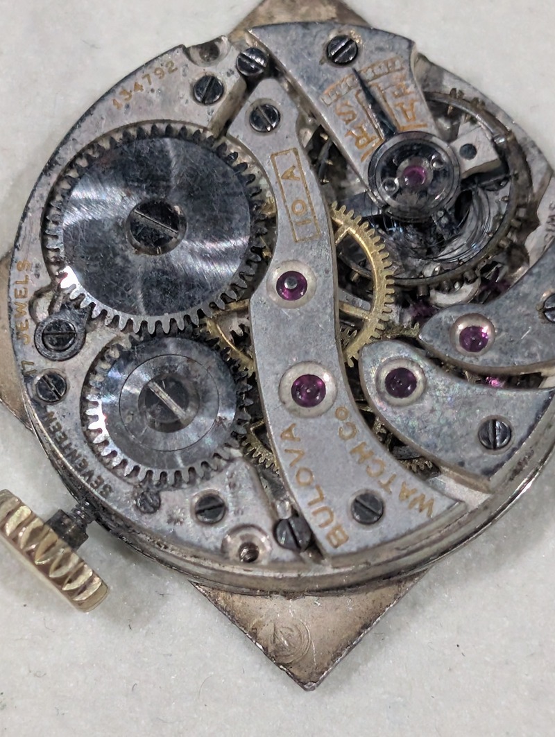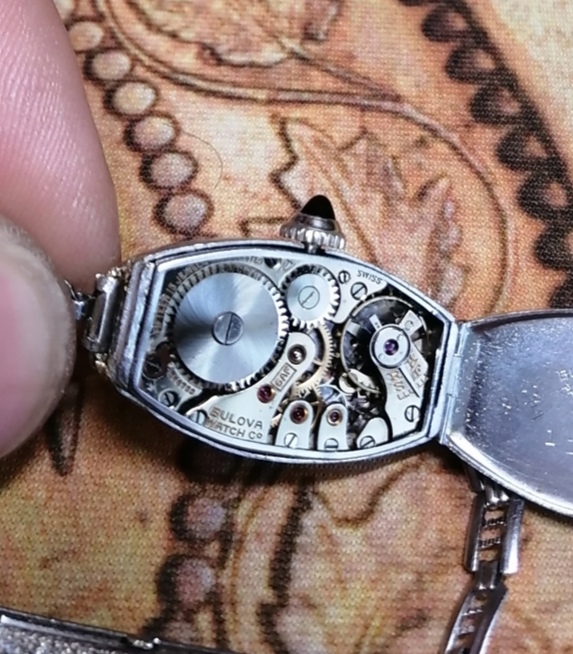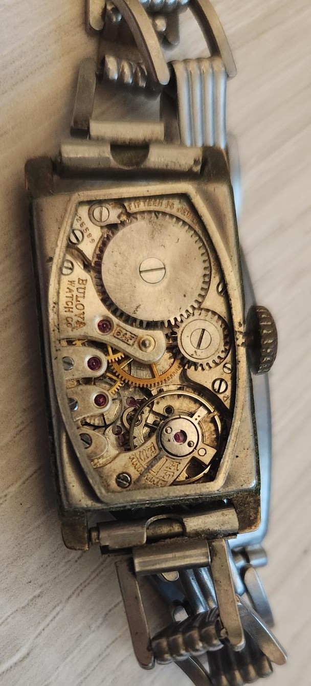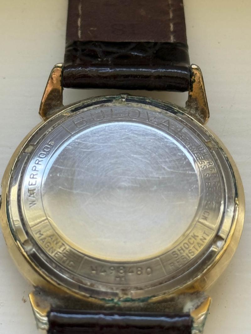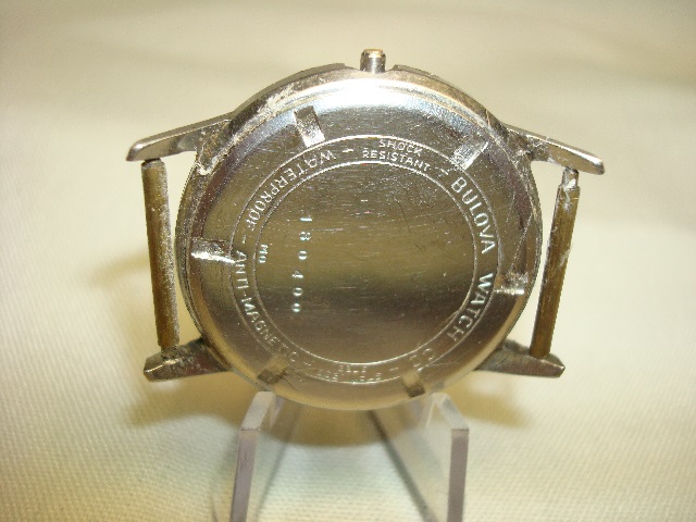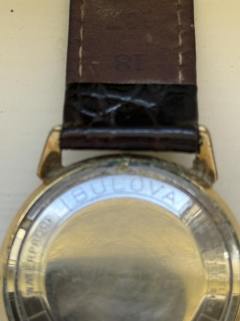 10K gold filled case, s/n J091701. Band probably not original. Inside case back reads: Bulova, Fifth Ave, New York. Powered by a manual wind, 21 jewel, manufactured in 1949 in the USA Bulova Watch Co. 6BA movement. Just serviced and running well for a movement this age. I have tentatively identified it as a 1947 Her Excellency "N".