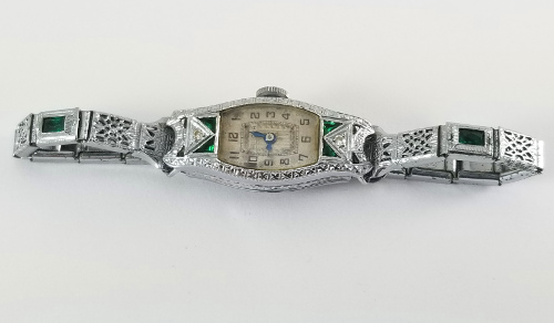 I believe this to be a 1929 Bulova Carolyn per the 1928 Ad we have in the database.  With the original filigree emerald bracelet along with the emerald and diamond bezel, it's a really fantasic watch.